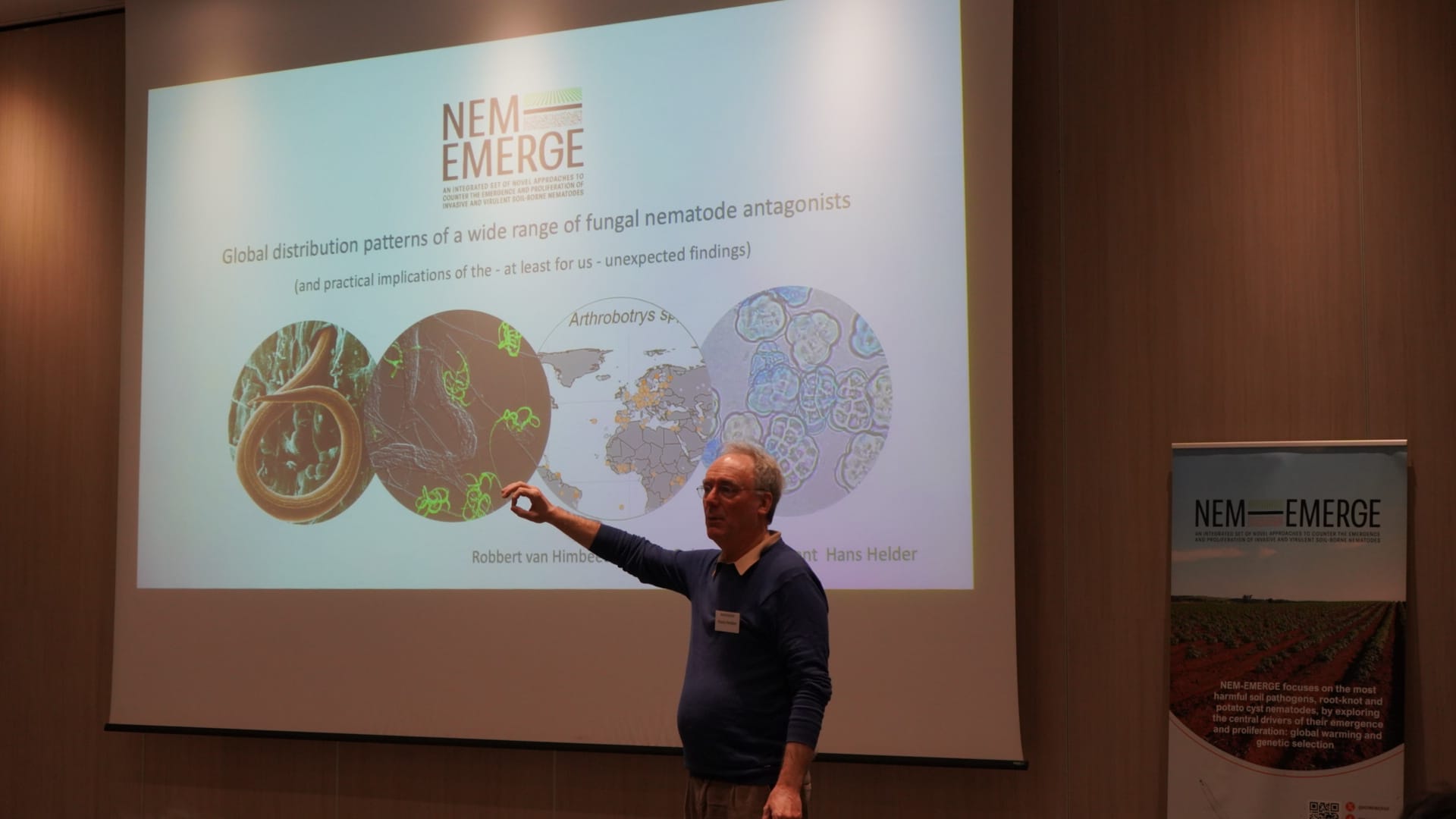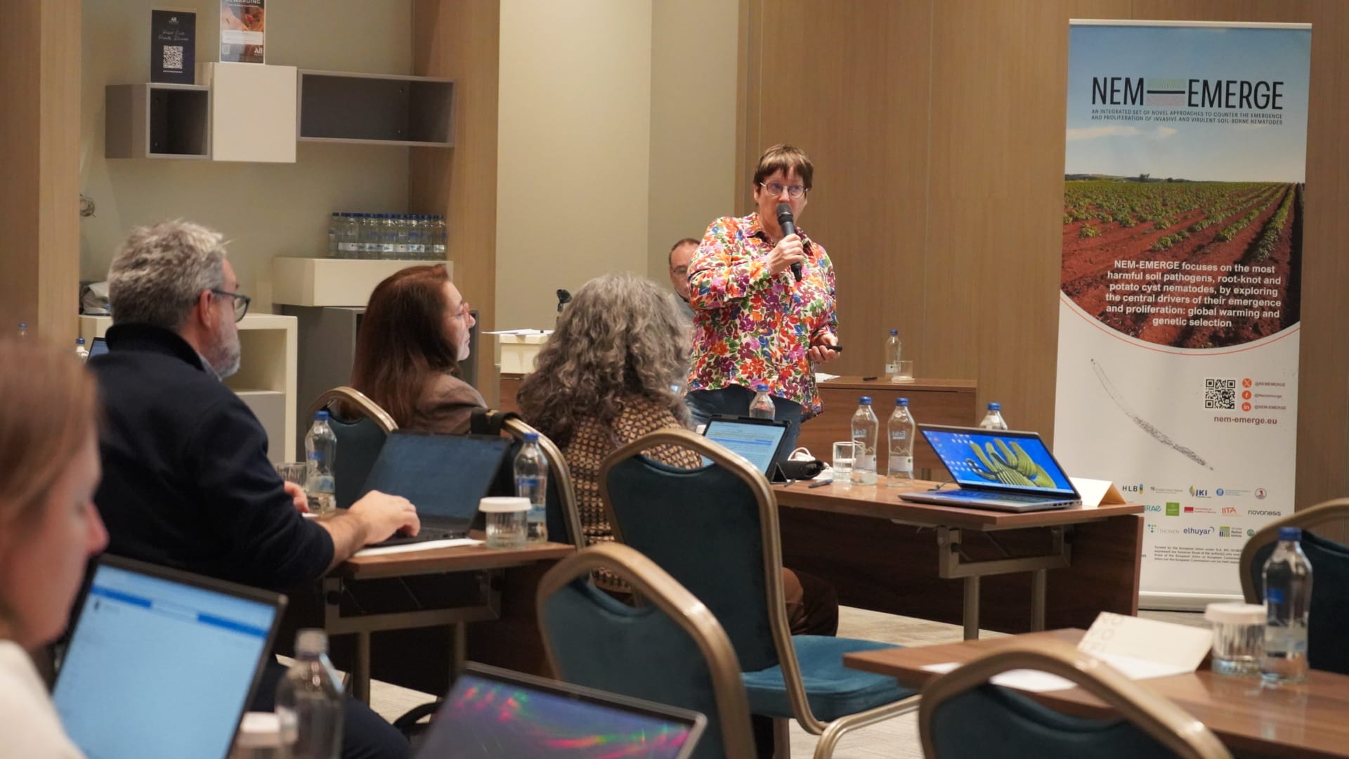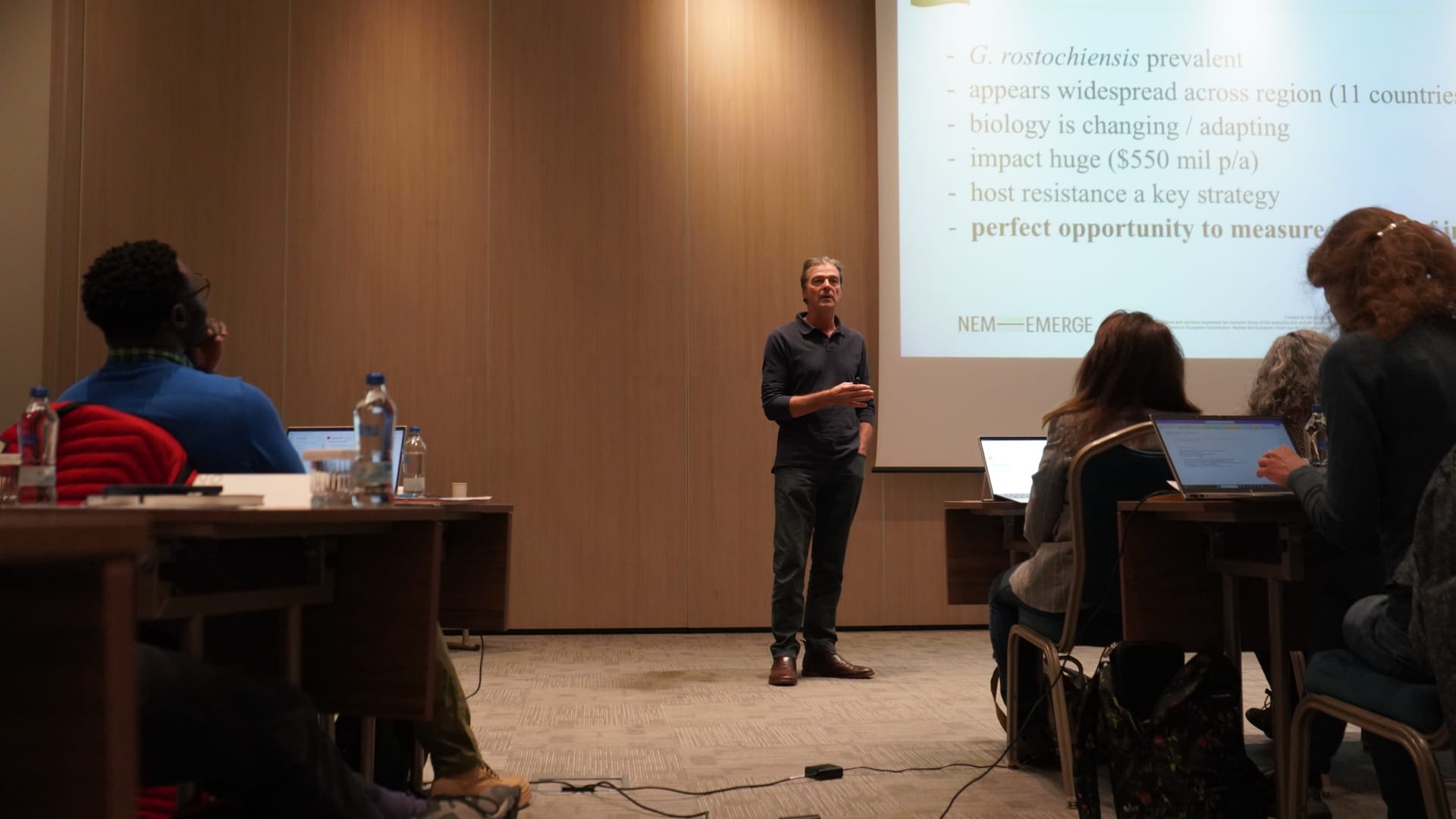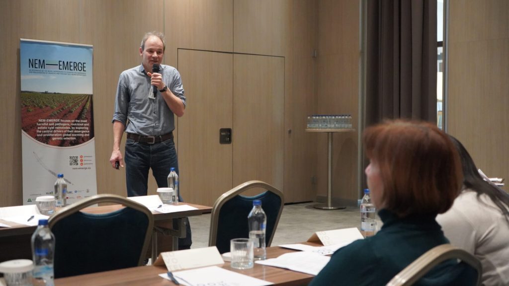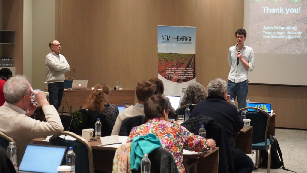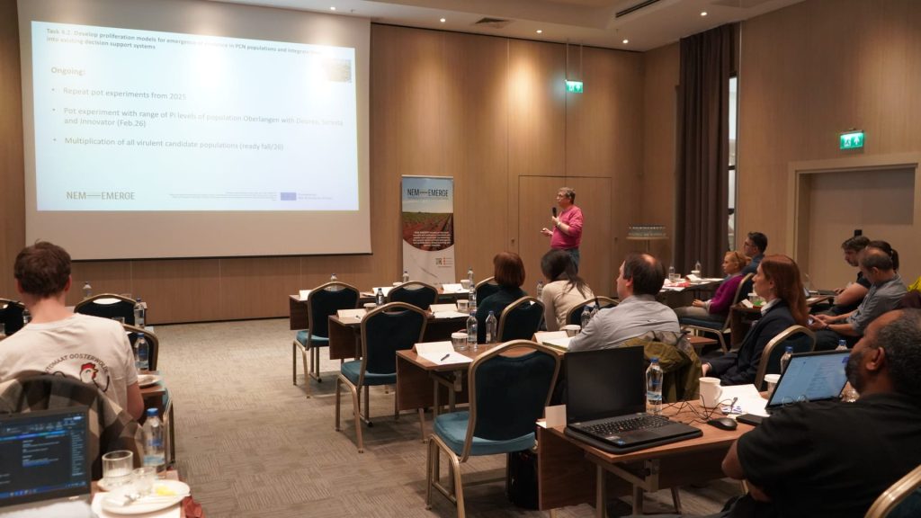 The third day of the 2nd Annual Meeting of NEM-EMERGE concluded with the same cooperative atmosphere that had characterised the entire event. The three meeting days were sprinkled with in-depth presentations of specific aspects and activities carried out in the different work packages, which led to intense discussions among the topic experts about the results presented. As a few examples, the topics discussed included explanations of the work carried out to understand the heat stability or instability of the Mi1 gene in tomato, research accomplished to identify and characterise novel sources of resistance in potato to control virulent populations, and the analysis made on the abundance and adaptiveness of nematode antagonists.