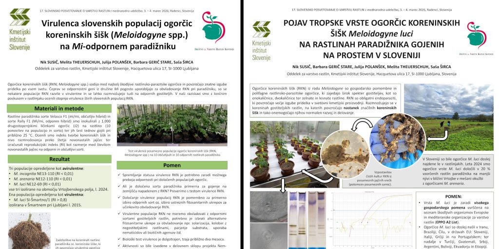The NEM-EMERGE partners presented two posters on the results obtained up to now, one on the virulence of Slovenian root-knot nematode (Meloidogyne spp.) populations against Mi-resistant tomato, and the other on the occurrence of tropical root-knot nematode Meloidogyne luci in field-grown tomato